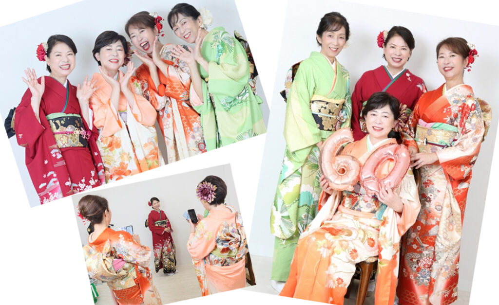 | 和装好きの仲間に誘われ、戸惑いながらの申込でしたが、初心者の私でも分かりやすく事前打合せくださいました。この段階で、帯や小物のコーデのご提案に感動! 小物、下着、髪飾りまで、無いものを沢山補って頂いたのも心強かったです。 当日は、仲間とワイワイ対話しているうちに、手早いプロの技のリレーで、あっという間に撮影へ。撮影中も、雰囲気を盛り立てて頂き、お蔭様で、スペシャルな還暦同窓会となりました。年月を重ねてきた友の、キレイだったこと! 改めてお互いに讃え合いたくなりました。 (還暦振袖グループプラン撮影) |